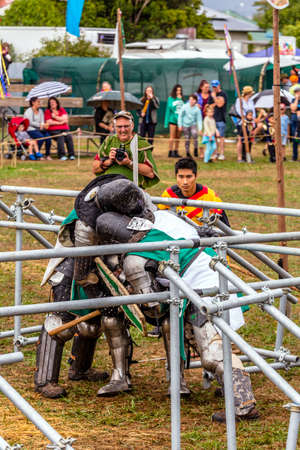 Levin, New Zealand - February 10, 2018: Reenactors battle at a medieval market in Levin showgrounds, New Zealand.