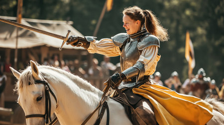 In a spirited reenactment, a female knight in armor competently wields a lance while riding a white horse at a jousting event.