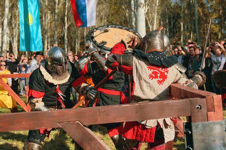 Reconstruction of medieval jousting tournaments. Festival of historical clubs. Two knights fight with swords in front of the audience. Bishkek, Kyrgyzstan - October 13, 2019