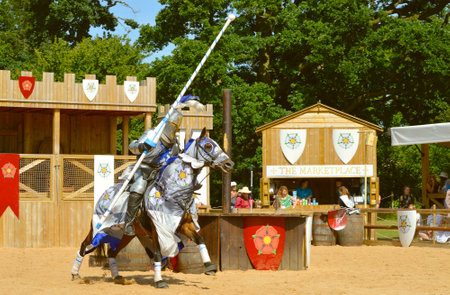 Brackley, UK - June 7th 2019: People dressed as medieval knights on horseback take part in a jousting competition