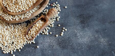 Raw White Sorghum grain in a bowl with a spoon on a grey table
