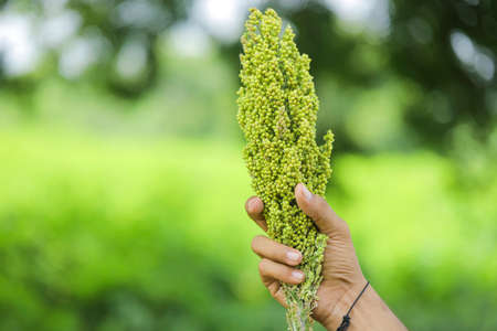 Hand-holding millet spike in the agriculture harvest field