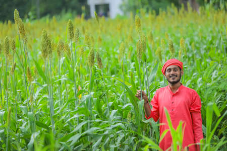 indian farmer standing in sorghum field