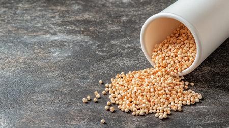 Fresh organic quinoa seeds spilling from a white container onto a rustic dark surface, showcasing a vibrant ingredient perfect for healthy cooking and nutritional recipes.