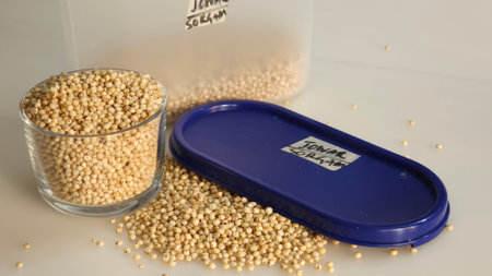 Closeup of sorghum millet grains kept in a storage container and glass bowl filled to the brim, highlighting the tiny, golden grains with a rich earthy hue. Perfect for food and health related concepts