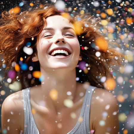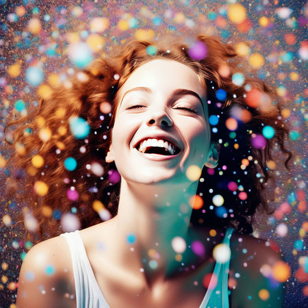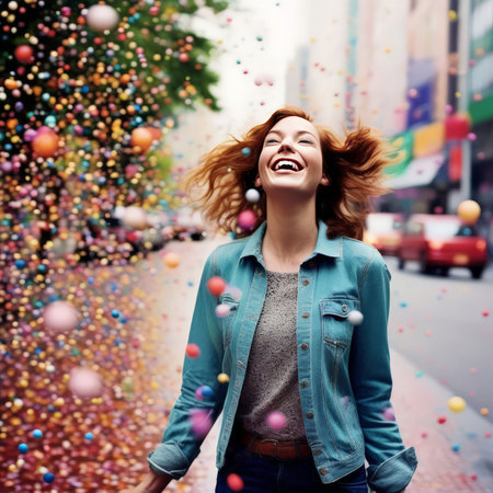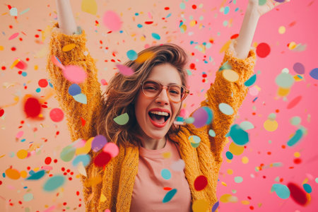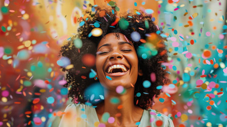 Joyful woman in bright jacket laughing amidst colorful confetti celebration.