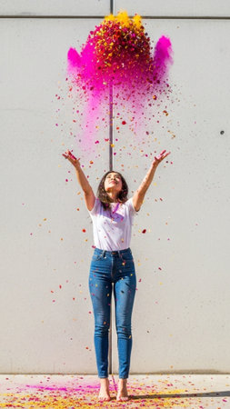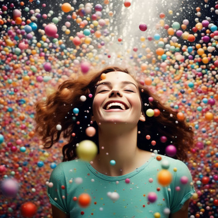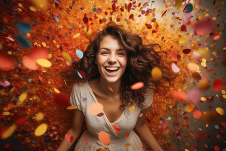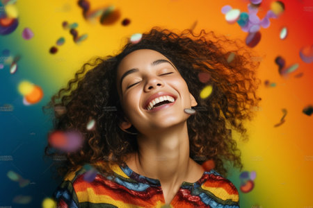 Happy woman, vibrant confetti and colorful joy. Joyful, lively and radiant lady in a spectrum of