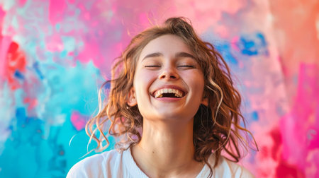 A woman laughs with eyes closed against a bright backdrop. Her long hair flows. The background features a blurred, colorful design, with blue, yellow, and pink hues. The image has a natural lighting. Suitable for various editorial and commercial applications.