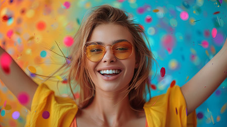 Portrait of a cheerful young woman in yellow, enjoying a celebration moment with vibrant confetti in the air.