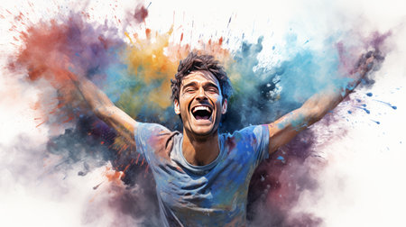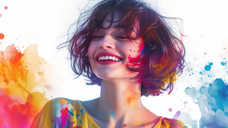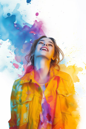 Excited young woman laughing on a splashed colors. Generative AI