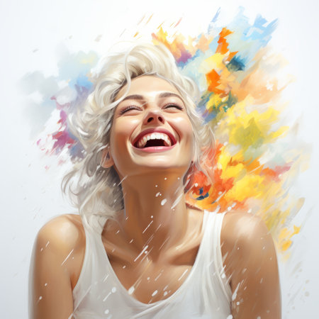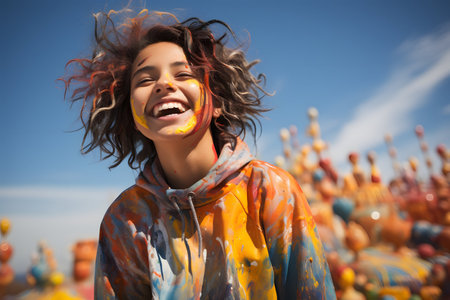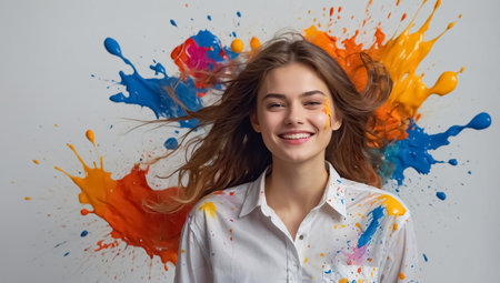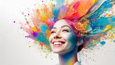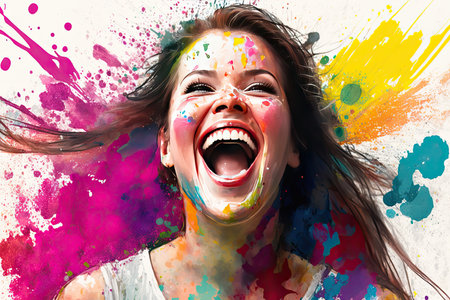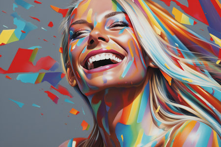 A lively and cheerful woman with bright paint and makeup expresses positivity and creativity. The vibrant colors showcase energy and artistic flair, creating a happy and inspiring composition bursting with personality.