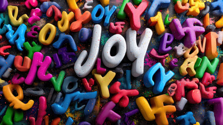 A lively arrangement of colorful plastic letters with the word Joy prominently displayed amidst a vibrant background of mixed letters. Perfect for educational themes.