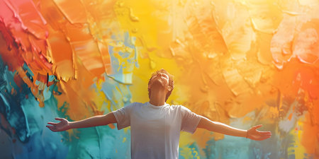 Man offers prayer with outstretched arms against backdrop of colorful pastel artwork. Concept Religious Meditation, Artistic Background, Spiritual Connection