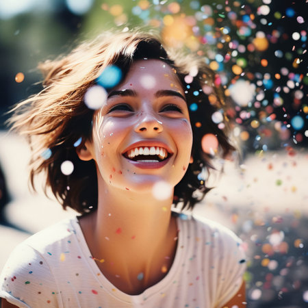 A young woman smiles brightly while standing outdoors surrounded by colorful confetti falling around her in a joyful celebration.