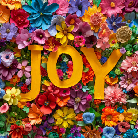 Floral collage with vibrant colors and bold JOY typography