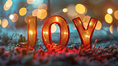 Large pink illuminated JOY sign glowing brightly, perfect for festive holiday decor or cheerful celebrations.