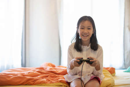 Cheerful Indian Asian kids playing video game using joystick or controller while sitting on sofa
