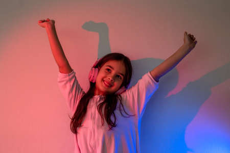 Young excited man with long curly hair listening to music in headhones isolated on gradient yellow-pink background in neon. Concept of beauty, fashion, youth culture and emotions