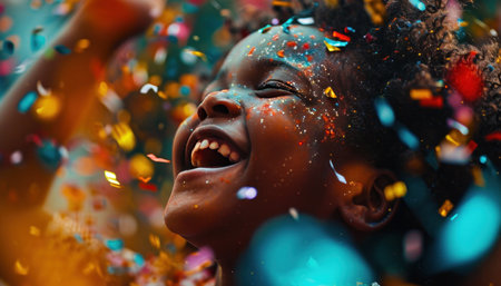 Young Lady rejoices in confetti rain, expressing exuberance and carefree joy with wind.