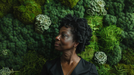 Woman with Natural Hair in Front of Lush Vertical Garden Wall with Succulents and Moss