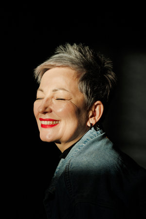 Portrait of smiling mature woman with red lips standing in sunlight on black background