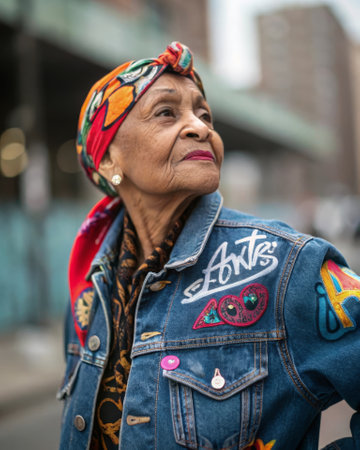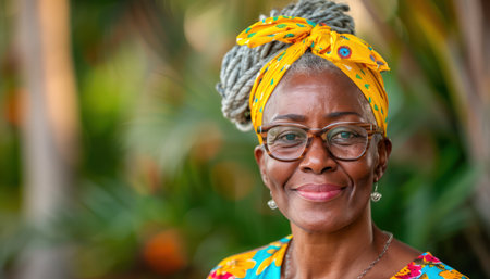 A graceful elder woman adorned in colorful traditional clothing and an ornate headwrap stands confidently amidst a sunlit background, radiating wisdom and heritage.