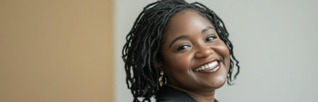 A joyful woman with natural hair smiles warmly in a contemporary indoor setting. Her confident expression reflects positivity and empowerment, inviting connection and warmth.