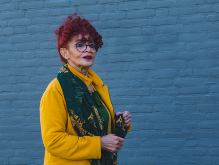 portrait of fashionable train of thought senior business woman outdoor close-up