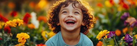A young boy with curly hair beams with happiness while sitting amidst colorful flowers in a sunny garden.