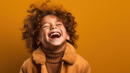A young child with curly hair laughs joyfully, capturing a moment of happiness against a vibrant yellow backdrop.