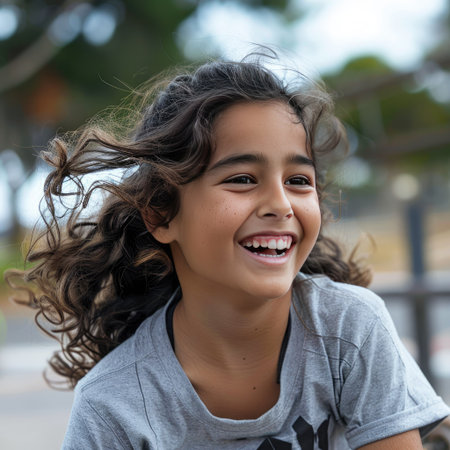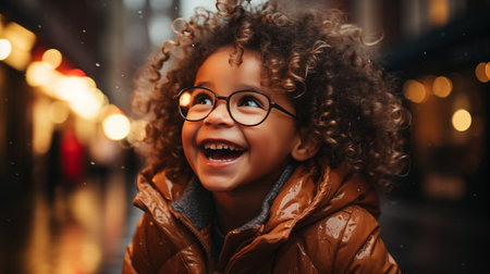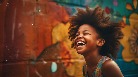 A radiant child with voluminous curls laughing