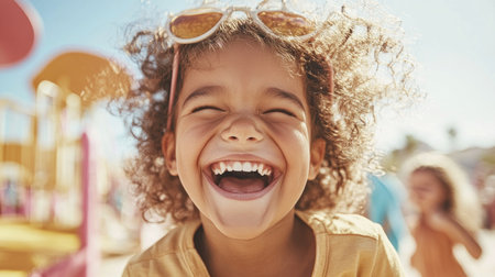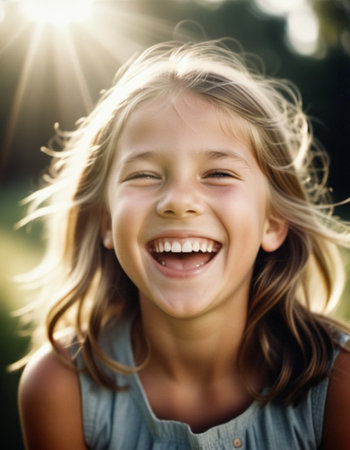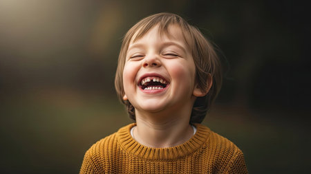 A young child is shown laughing with eyes closed in a portrait. The image displays warm tones and natural lighting. The composition features a shallow depth of field, with the child in sharp focus against a blurred background. Suitable for diverse editorial and commercial applications.