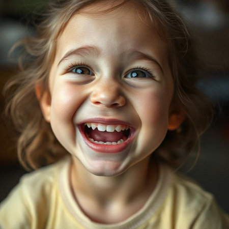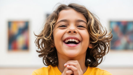 A young child, appearing cheerful, smiles widely while looking towards the viewer. The image features a bright, warm color palette, with soft lighting illuminating the subject. The composition includes an indoor setting with artwork visible in the background. Suitable for various editorial and commercial applications.
