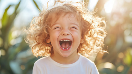 Child with curly hair laughing outdoors in sunlight during daytime