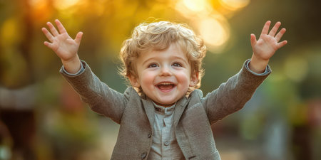 A young boy with curly hair raises his hands in excitement, wearing a gray suit. The warm golden light of sunset creates a cheerful atmosphere around him.