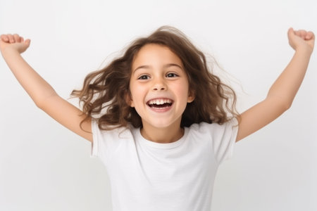 Cheerful little girl in white t-shirt with raised hands on white background