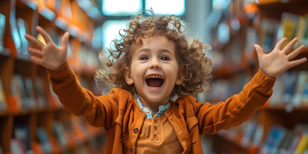 Excited child in a library celebrating World Book Day and International Education Day. Concept Education, Reading, Library, World Book Day, International Education Day