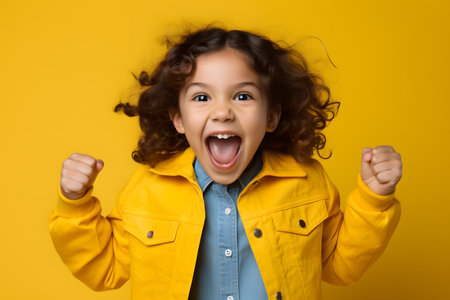 A cheerful young boy with curly hair is jumping with excitement against a vibrant yellow wall. His infectious smile and playful energy radiate pure joy, capturing the essence of childhood happiness.