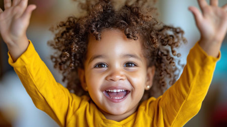A little girl with curly hair smiling and holding her hands up, AI