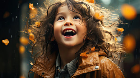 Generative AI : happy funny child girl in a spray of water droplets laughs