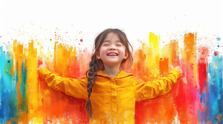 happy little girl with colorful paint splashes isolated on white background.