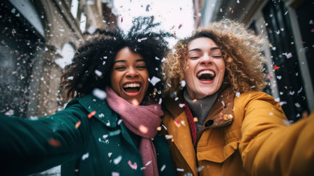 Friends taking selfie in the city. lifestyle. generative ai. Concept of friends of different nationalities.
