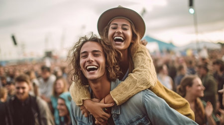 Generative AI portrait of man carrying ecstatic woman on shoulders at music festival