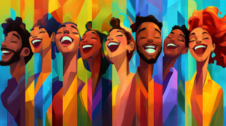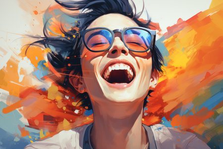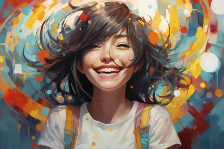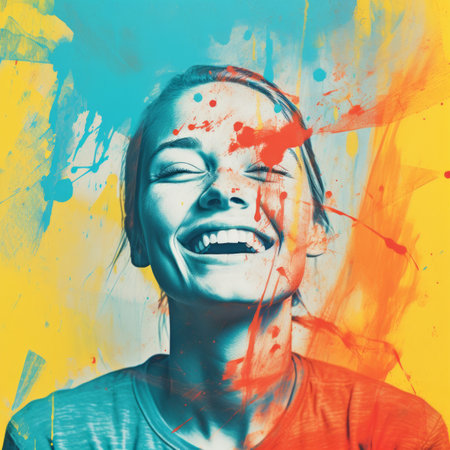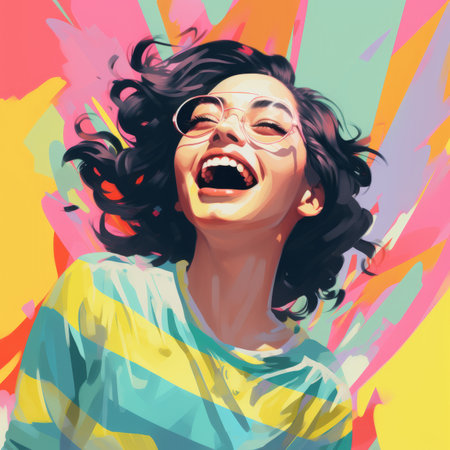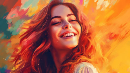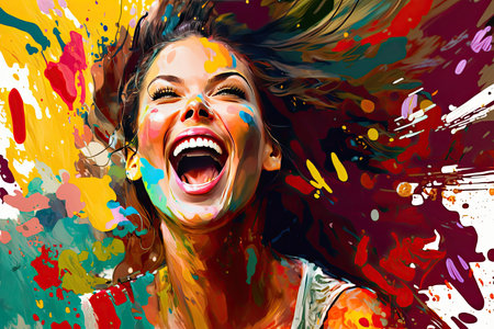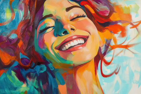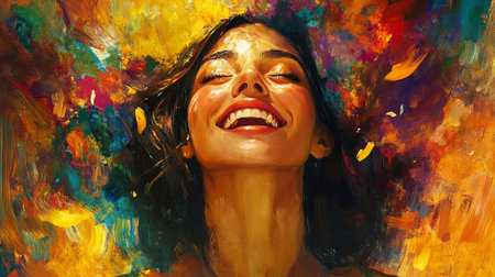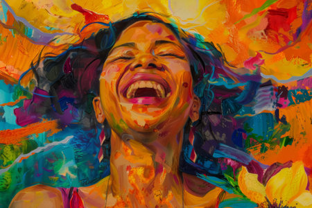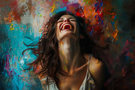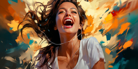 Vibrant and colorful painting of a joyful woman laughing in a lively, abstract setting. Concepts of happiness, art, and social interactions in a dynamic atmosphere.