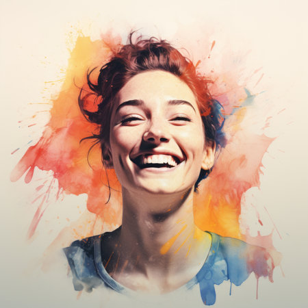 A woman wearing a stylish hat smiles joyfully while looking up, surrounded by a colorful watercolor backdrop that radiates happiness and liveliness.