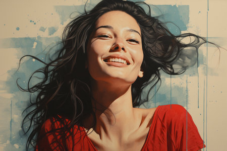 A woman laughs with eyes closed against a bright backdrop. Her long hair flows. The background features a blurred, colorful design, with blue, yellow, and pink hues. The image has a natural lighting. Suitable for various editorial and commercial applications.