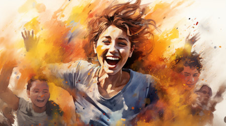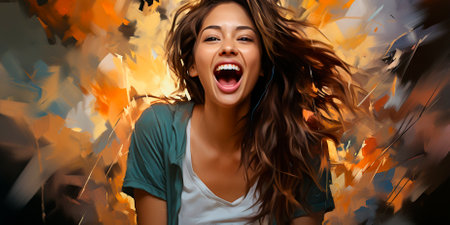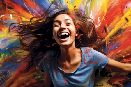 Excited young woman laughing on a splashed colors. Generative AI