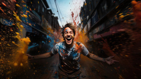 Happy young man throwing paint in the air, having fun during holi festival