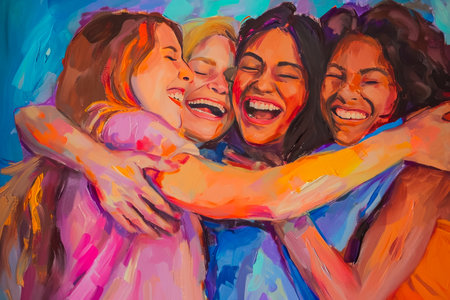 heartwarming and positive artwork depicting a group of friends hugging and laughing together.