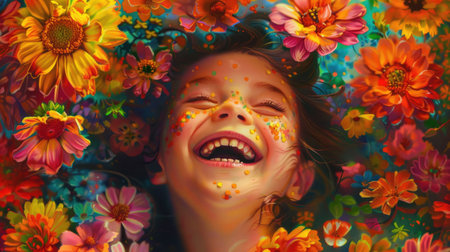 A young girl is beaming with a smile surrounded by vibrant flowers. The colorful petals cascade around her, creating a beautiful botanical scene perfect for a photograph AIG50